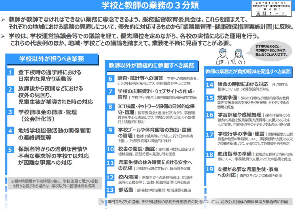 先日(令和7年8月19日)に開かれた中教審の特別部会において、学校の働き方改革に関するいわゆる「3分類」の改定案が示されました(その後の部会で確定されました)。そこで、今回は「3分類」の改定の内容について書きたいと思います。
