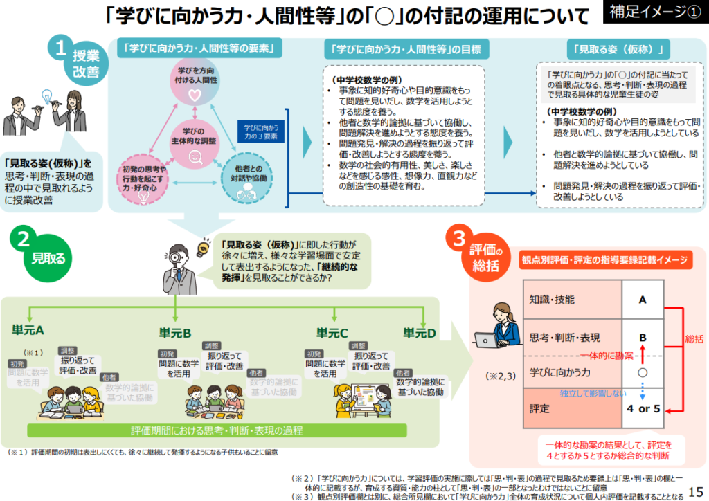 結論を先に言えば、「学びに向かう力・人間性等」の児童生徒の姿を教師が見取り、「思考・判断・表現」の過程で特に表出した場合に「◯」をつけることとする方向性です。