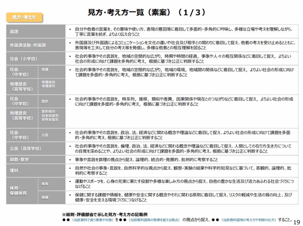 まずは、各教科の「見方・考え方」です。なお、これについては、「検討中のたたき台」とされていますので、その点ご留意願います(その他の教科等については、本記事末尾のリンク先からご覧ください)。