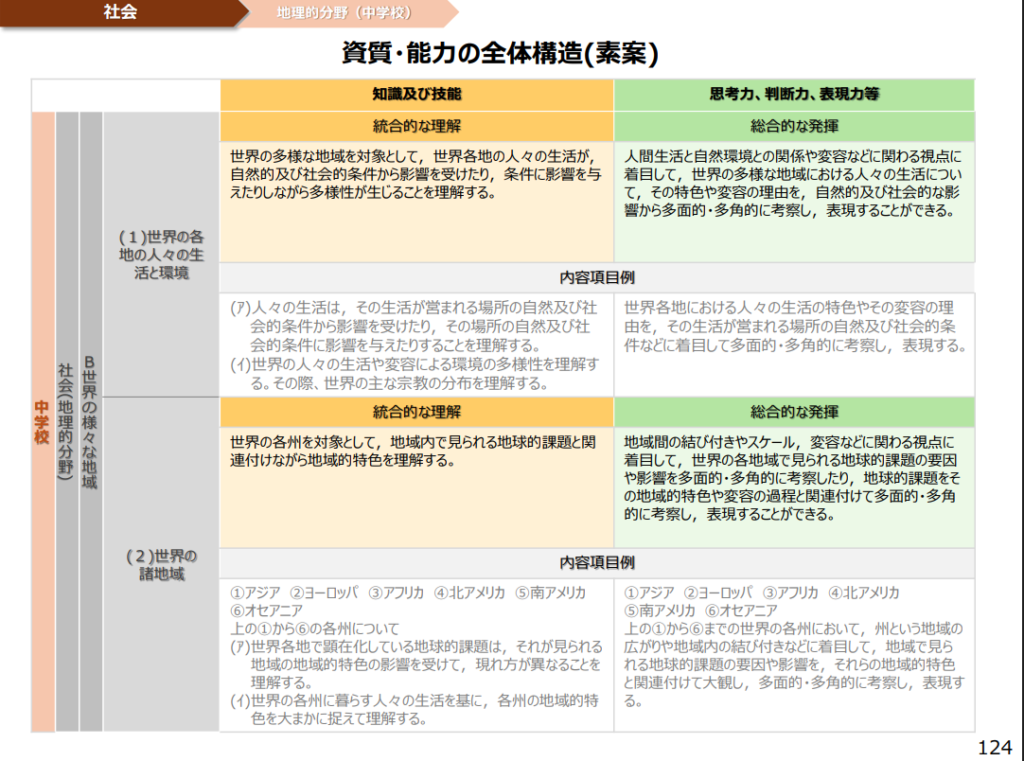 例えば、僕の専門教科である社会科では、「知識及び技能の系統性が明確であり、個々の知識及び技能と一体的に育成する思考力・判断力・表現力等を具体的に示すことが授業改善に繋がることから、「並列パターン」での構造化を検討」するとのことです。