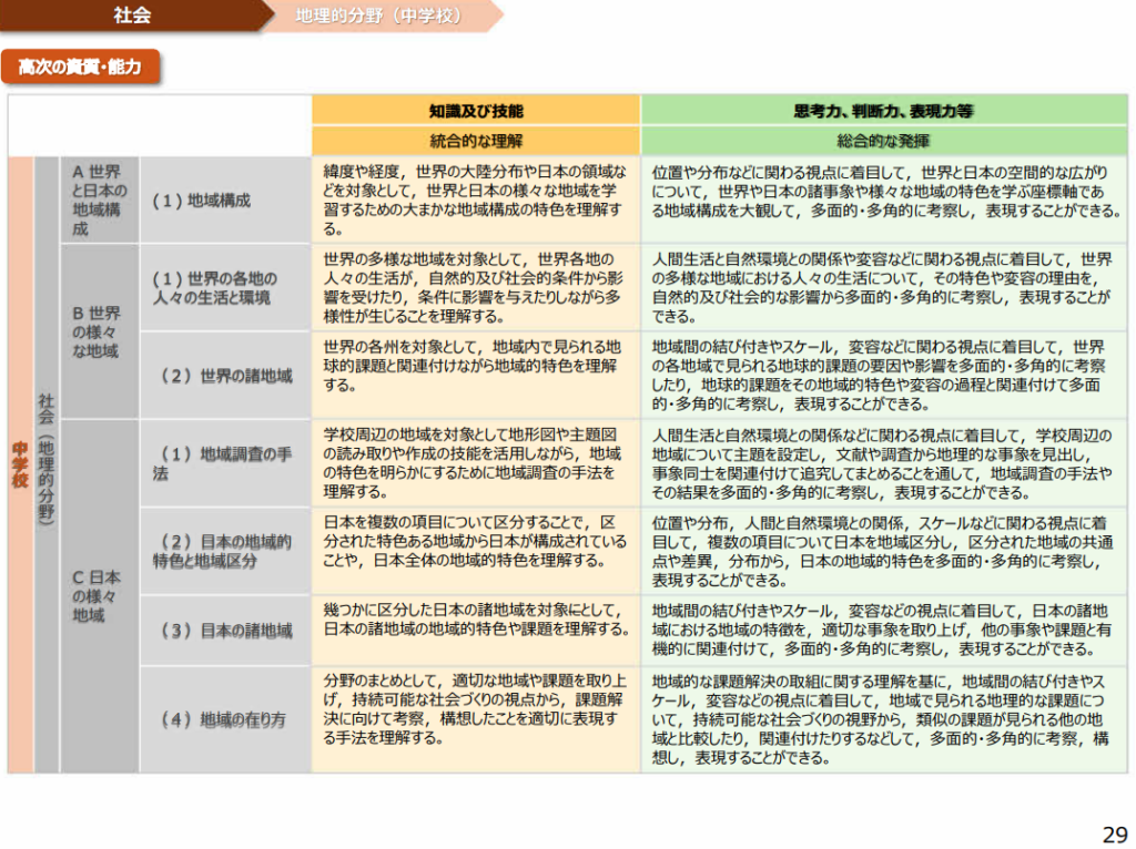 結論を先に言えば、高次の資質・能力と単元ごとの内容項目を表形式にして示すこととしています。