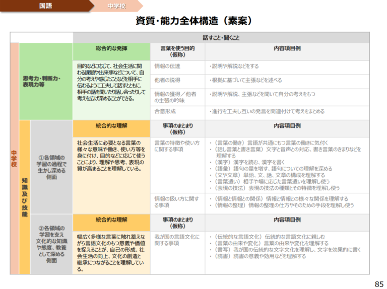 一方、国語科は「思考力・判断力・表現力等の系統性が明確であり、知識及び技能が全体として思考力・判断力・表現力等の深まりを助けることを明確にするため、「並行パターン」での表形式化を検討」という記載があります。